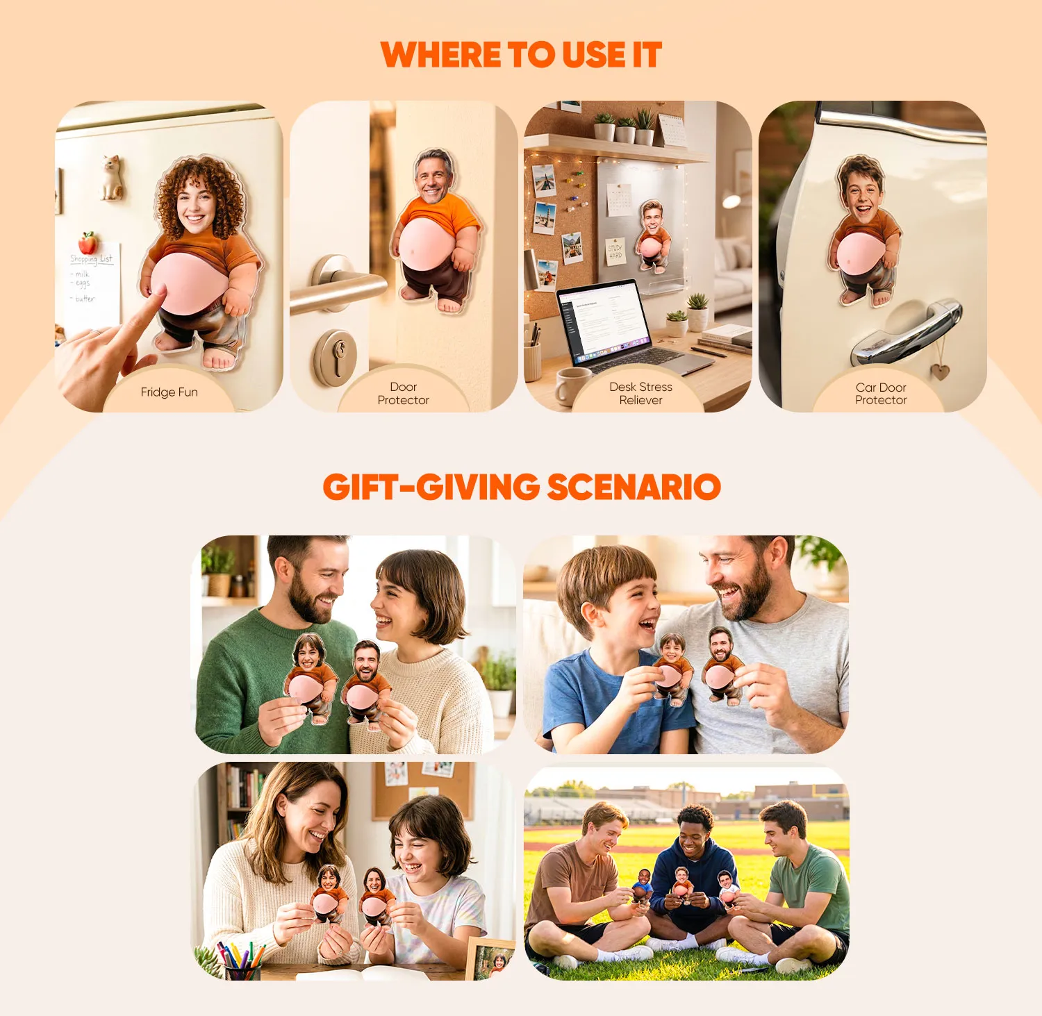 Stick it on your fridge as a funny little reminder to snack less, Or place it on a car door or behind a door as a soft bumper to avoid bumps - cute and surprisingly practical. Also great for laptops, phones, desks, notebooks, or mirrors.